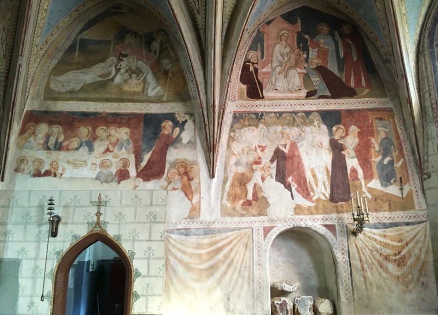 Nástenné maľby v presbytériu datované do prvej tretiny 15. storočia zobrazujú okrem dlhšie odkrytého (a v roku 2020 očisteného) motívu Narodenie a kúpanie malého Ježiša aj Poslednú večeru, Krista v Getsemane, Judášov bozk, Krista pred Pilátom a Kľaňanie sa troch kráľov.